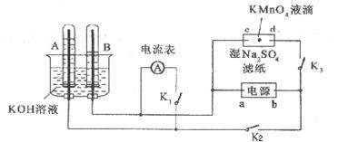 4、填空题 下图所示实验中,A、B中的电极为多孔铂电极,c、d为夹在经Na2SO4溶液浸湿的滤纸条上的铂夹,a、b为电源的两极。将A、B中充满KOH溶液后倒立于盛有KOH溶液的水槽中,断开开关K1,闭合K2、K3,通以直流电。