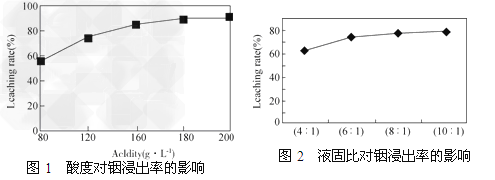 从火法炼锌蒸馏后的残渣中含多种金属单质及In2O3,可用硫酸提取铟,某研究机构对此研究数据如下。实验中涉及的酸度(每升溶液中含硫酸的质量)与铟的浸出率如下图1;硫酸溶液的体积与固体的体积比如下图2。???