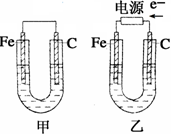 2、填空题 (13分)如右图所示,甲、乙两池电极材料都是铁棒和碳棒,请回答下列问题: