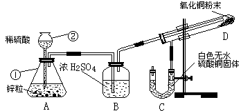 ⑴ 写出编号仪器的名称: ①______________ ⑵ 写出A中反应的离子方程式_____________________________ ⑶ 浓H2SO4的作用是_____________________ ⑷ 本实验需要加热的装置为____________(填字母编号)。 ⑸ 写出装置C、D中可观察到的现象:C______?????????????? ___,D______??????????????___ ⑹ D中反应每生成1mol水分子,转移的电子数为____________个。