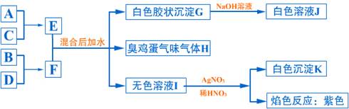 参考答案:1. 本题解析:从题干看,基本得不出什么直接的结论。但框图中有几个“特征的反应现象”作“题眼”:a 臭鸡蛋气味气体;b 白色胶状沉淀溶于NaOH溶液;c 先加AgNO3溶液,再加稀HNO3产生白色沉淀;d 焰色反应:紫色;可分别得出气体是H2S、白色胶状沉淀是Al(OH)3、无色溶液I是KCl,从而迅速得出其他结论。