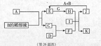 5、填空题 下图是中学化学中常见的一些单质或化合物之间的转化关系图,其中部分反应中涉及到的水未列出。已知A、B、F是人类生存或日常生活中必不可少的物质,I、J均具有漂白性,但两者混合后的产物均不具有漂白性。