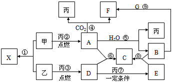1、推断题 甲、乙、丙为常见单质,乙、丙两元素在周期表中位于同一主族。X、A、B、C、 D、E、F、G均为常见的化合物,其中A和X 的摩尔质量相同,A、F的焰色反应为黄色。在一定条件下,各物质相互转化关系如图。请回答: