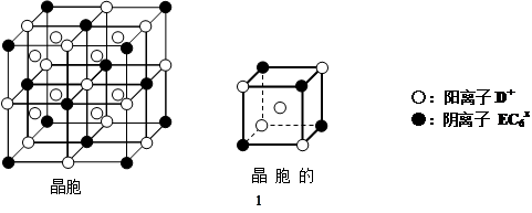 ⑷C、D、E可组成离子化合物DxEC6,其晶胞(晶胞是在晶体中具有代表性的最小重复单元)结构如下图所示,阳离子D+(用○表示)位于正方体的棱的中点和正方体内部;阴离子EC6x-(用●表示)位于该正方体的顶点和面心。该化合物的化学式是???????????????。