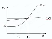 本题解析:根据图像可知,硝酸钾的溶解度受温度的影响大于氯化钠的,选项A不正确;选项B不正确,应该是100g水中含有20g硝酸钾;温度为t2是,二者的溶解度相等,因此质量分数是相等的,选项C不正确;因此正确的答案选D,答案选D。