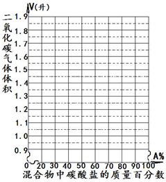 | 二氧化碳气体体积(升) | 0.93 | 1.12 | 1.31 | 1.49 | 1.68 碳酸盐的质量百分数(A%) 50 60 70 80 90