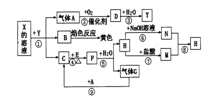 3、填空题 如下图表示有关物质之间的转化关系,其中X是一种正盐,Y是一种强酸,C是淡黄色固体,E是常见的金属单质.(反应①⑥⑦⑧⑨中的部分产物已略去).
