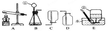 (2)气体发生装置A可用来制取氧气,其反应方程式为___________________________。选择的收集装置是______(选“C”或“D”)。若用E装置收集氧气完毕时,应先?????(填序号①或②:①熄灭酒精灯;②从水中取出导气管)