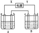 4、填空题 (6分)如图所示装置,X、Y为电源的两极,a、b均为石墨电极,c为铜电极,d为铁电极,A槽中盛装稀硫酸,B槽中盛装CuSO4溶液。通电一段时间后,发现d电极上覆盖一层红色物质。