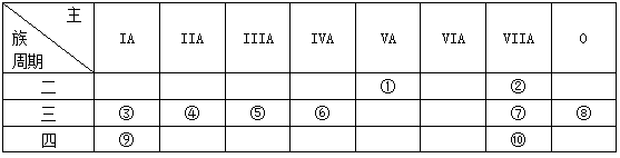 2、填空题 (14分)下表是元素周期表的一部分,针对表中的①~⑩中元素,用元素符号或化学式填空回答以下问题: