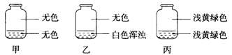 5、选择题 向盛有Cl2的三个集气瓶甲、乙、丙中各加入下列液体中的一种,经振荡,现象如下图所示,则甲、乙、丙、中注入的液体分别是