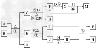 3、推断题 已知A~J物质是由周期表中1~20号元素组成的10种物质,其中常温常压下C、D、F、G、I均呈气态,H为无色液体,M为三大强酸之一。反应②③④⑥为工业生产中重要的反应。等物质的量的A、B充分混合后加热能恰好完全反应(如下图所示),E的式量为100。图中反应条件(除加热外)均已略去。