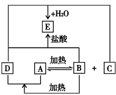 1、推断题 已知A、B、D、E中有一种元素相同,这些物质化学式中只含有这种元素的一个原子,且E在C中可燃烧,火焰呈蓝紫色,A、B、D是白色固体,E是浅黄色固体,A、B、D、E均不含结晶水,A、B、D其焰色反应呈黄色。