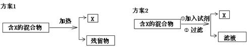 试题分析:A、在加热的条件下,碳酸氢钠也会被分解,错误;B、方案1中残留物不具有受热易挥发的性质,而X具有受热易挥发的性质也可以达到分离的目的,错误;C、方案2中加入的试剂也可能是一种萃取剂,而不跟所有的物质发生反应,错误;D、方案2中加入NaOH溶液可以跟二氧化硅反应,但是不能跟三氧化二铁反应,可以分离出SiO2和Fe2O3混合物中的Fe2O3,正确。