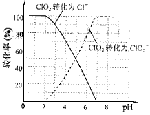 (2)用ClO2处理过的饮用水(pH为5.5~6.5)常含有一定量对人体不利的亚氯酸根离子(ClO2-)2001年我国卫生部规定,饮用水ClO2-的含量应不超过0.2 mg·L-1。饮用水中ClO2、ClO2-的含量可用连续碘量法进行测定。ClO2被I-还原为ClO2-、Cl-的 转化率与溶液pH的关系如图所示。当pH≤2.0时,ClO2-也能被I-完全还原成Cl-。反应生成的I2用标准Na2S2O3溶液滴定:2Na2S2O3+I2=Na2S4O6+2NaI