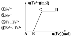 1、填空题 在一定量的稀HNO3中慢慢加入铁粉,得到的Fe2+的物质的量(纵坐标)与所加铁粉的物质的量(横坐标)的关系如图所示。请将正确答案的序号填在相应的横线上。