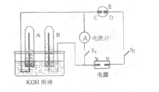 3、填空题 在如右图所示的实验装置中,E为一张淀粉、碘化钾和酚酞混合溶液润湿的滤纸,C、D为夹在滤纸两端的铂夹,X、Y分别为直流电源的两极。 在A、B中充满KOH溶液后倒立于盛有KOH
