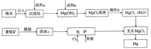 填空题 (7分)金属镁的制取主要有两种途径,大约60%的镁是从海水中提取的,其余来自于含镁丰富的矿石,比如菱镁矿(主要成分为MgCO3)。从不同途径获得镁的流程如下: