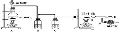 (4)由于和硅反应的氯气必需是纯净干燥的,而生成的氯气中含有氯化氢和水蒸气,所以B中盛有饱和食盐水除去氯化氢,C中是浓硫酸干燥氯气。氯气有毒,需要尾气处理。另一方面生成物四氯化硅极易和水反应,所以F中碱石灰的作用是①吸收多余氯气,②防止空气中水蒸气从末端进入D中。