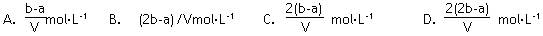 4、选择题 把V L含有MgS04和K2S04的混合溶液分成两等份,一份加入含a mol NaOH的溶液,恰好使镁离子完全沉淀为氢氧化镁:另一份加入含b mol BaCl2的溶液,恰好使硫酸根离子完全沉淀为硫酸钡。则原混合溶液中钾离子的浓度为