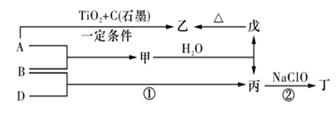 (6)—定条件下,A与TiO2、C(石墨)反应只生成乙和碳化钛(TiC),二者均为某些高温结构陶瓷的主要成分。已知,该反应生成1 mol乙时放出536 kJ热量,其热化学方程式为_______________________________。