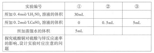 本题解析:本实验探究硫酸铜对硫酸与锌反应速率的影响,因此要控制硫酸的浓度、用量相同(均为0.4mol/L,30mL)、温度相同、锌的表面积相同,溶液的总体积相同为35 mL,硫酸铜量不同,反应过程中锌除了与硫酸反应外还与CuSO4反应生成Cu,②号实验最快,③号实验最慢,可能是CuSO4与Zn反应产生的Cu与Zn形成原电池,加快氢气产生的速率,较多的CuSO4加入后与Zn反应产生的Cu大量沉积在Zn表面,降低了Zn与溶液的接触面积。