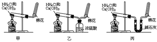 实验题 甲、乙、丙三位同学分别用如下三套实验装置及化学药品(其中碱石灰为固体氢氧化钠和生石灰的混合物)制取氨气。请你参与探究,并回答下列问题: