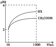 ? 回答下列问题。 (1)物质的量浓度为0.1 mol·L-1的下列四种物质,pH由大到小的顺序是________(填编号)。 a.Na2CO3? b.NaClO c.CH3COONa? d.NaHCO3 (2)常温下0.1 mol·L-1的CH3COOH溶液加水稀释过程中,下列各量一定变小的是________(填编号)。 A.c(H+) ??????????????????B.c(CH3COO-) C.c(H+)·c(OH-)????????D. (3)体积均为10 mL、pH均为2的醋酸溶液与HX溶液分别加水稀释至1 000 mL,稀释过程中pH变化如图所示。则HX的电离平衡常数________(填“大于”、“等于”或“小于”)醋酸的电离平衡常数,理由是__________________;稀释后,HX溶液中水电离出来的c(H+)________(填“大于”、“等于”或“小于”)醋酸溶液中水电离出来的c(H+),理由是_________________________________________________________________。