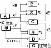 3、填空题 (10分)甲、乙、丙是常见三种单质,化合物A、B、C、D和甲的焰色反应均呈黄色。F常温下为无色呈液体。它们的转化关系如图。