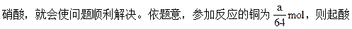 本题解析:因为铜与硝酸反应时,硝酸的浓度不同,其还原产物是不同的。此题用逆向思维,首先考虑未被还原的硝酸,再换算出被还原的