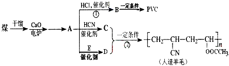5、填空题 近年来,由于石油价格不断上涨,以煤为原料制备一些化工产品的前景又被看好。下图是以煤为原料生产聚氯乙烯(PVC)和人造羊毛的合成路线。