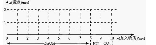 本题解析:根据试剂可知,反应的方程式先后为Fe3++3OH-=Fe(OH)3、Al3++3OH-=Al(OH)3,此时消耗氢氧化钠是6mol。则继续加入氢氧化钠,氢氧化铝溶解,方程式为Al(OH)3+OH-=AlO2-+2H2O。所以此时加入的2mol氢氧化钠,剩余1mol。因此加入盐酸,首先中和剩余的氢氧化钠,需要1mol盐酸。如果此时通入CO2,则CO2和偏铝酸钠反应生成氢氧化铝沉淀,方程式为CO2+2AlO2-+3H2O=2Al(OH)3↓+CO32-,消耗CO2是0.5mol。则另外0.5molCO2和生成的碳酸钠反应,生成碳酸氢钠,方程式为CO2+ CO32-+H2O=2HCO3-。