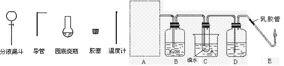 ①请选用左图实验仪 器示意图在方框内画出乙烯的发生装置(夹持装置不必画出,需要加热的仪器下方用△标出)。 ②B和D装置都盛有NaOH溶液,它们的作用是:B? ____? __、D_________________。 ③试写出以乙醇、浓硫酸、溴水为主要原料制取1,2—二溴乙烷的主要化学反应方程式。 _________________________________________________ _________________________________________________ ④实验室用E图装置点燃乙烯,燃烧时 会产生黑烟,实验时若要迅速熄灭火焰,最简单、安全的操作方法是:?。 (2)实验室可用C2H518OH和乙酸按图示装置制取少量乙酸乙酯(酒精灯等在图中均已略去)