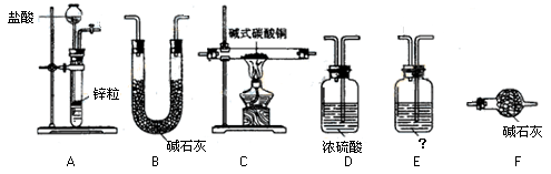 ③E装置的作用是___________________,E中的药品最好是______________ A.水? B.饱和碳酸钠溶液? C.饱和碳酸氢钠溶液? D.氢氧化钠溶液 ④称取23.9g某碱式碳酸铜样品,充分反应后得到12.7g残留物,生成4.4g二氧化碳和7.2g水。该样品的结晶水质量为??g,化学式为?; (2)某同学以氮气代替氢气,并用上述全部或部分仪器来测定碱式碳酸铜的组成,你认为是否可行?_______(填“可行”或“不可行”)如果可行写出反应的化学方程式:(认为不可行此空可不填)?。
