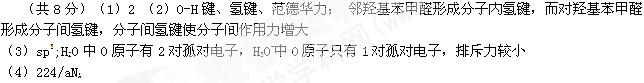 (2)H2O分子内的O-H键、分子间的范德华力和分子间氢键从强到弱依次为?。邻羟基苯甲醛比对羟基苯甲醛的沸点?(填“低”或“高”),其原因为?。
