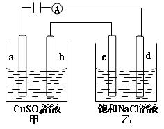本题解析:本题考查电化学的知识,试验难度中等。a极与电源的正极相连,a为电解池的阳极,b为阴极,电解硫酸铜溶液,则OH-在阳极上放电,电极反应式为:4OH--4e-=O2↑+2H2O,A项正确;在乙中c为阳极,d为阴极,电解饱和氯化钠溶液,阳极:2Cl--2e-=Cl2↑,阴极:2H++2e-=H2↑,加入酚酞,在阴极附近变红,B项错误;根据电极反应,2NaCl+2H2O