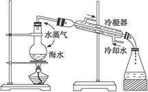 本题解析:海水蒸馏分离的是水和无机盐,由于无机盐很难挥发,加热至水沸腾时只有水蒸气逸出,而无机盐不会逸出,所以无须温度计控制温度。冷凝管中水流的方向应该是下口进上口出,以便冷凝管内充满水,使冷凝管内的气体充分冷凝。黏稠状的液体加热时会暴沸,必须加碎瓷片;海水加热不会出现暴沸现象,不需要加沸石。海水加热蒸馏时蒸出的水中不再含有无机盐,所以为淡水。