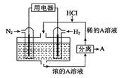 本题解析:A.该电池的本质是合成氨反应,所以正极是氮气发生还原反应,电极反应式为N2 + 6e- + 8H+=2NH4+,正确;B.反应过程中,H+不断消耗导致PH值变大,需要加入盐酸,正确;C.该装置是原电池装置,电流由正极通过外电路流向负极,即由通入氮气的电极沿外电路流向通入氢气的电极,错误;D.通入氢气的电极为负极,生成的铵根离子与氯化氢结合生成氯化铵,所以A是NH4Cl,正确;选C。