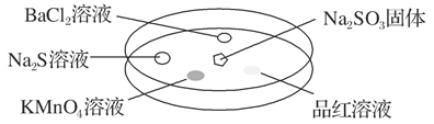 4、选择题 如图,利用培养皿探究SO2的性质。实验时向Na2SO3固体上滴几滴浓硫酸,立即用另一表面皿扣在上面。