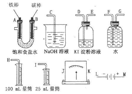 4、填空题 请从图中选用必要的装置进行电解饱和食盐水的实验,要求测定产生的氢气的体积(大于25mL),并检验氯气的氧化性。
