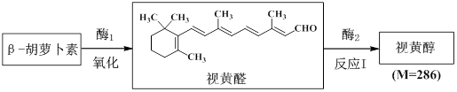 4、填空题 胡萝卜中含有大量的β-胡萝卜素,被人体吸收后可转化成视黄醇(即维生素A),是目前最安全补充维生素A的产品。在体内酶的催化下,1 mol β-胡萝卜素可氧化为2 mol视黄醛,然后再转化为视黄醇,其过程如下: