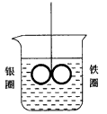 5、选择题 如图所示,烧杯内盛的是水,铁圈和银圈直接相连接,在接头处用一根绝缘细线吊住使之平衡,小心地向烧杯中央滴入CuSO4溶液,反应一段时间后,观察到的现象是?
