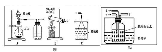 本题解析:(1)杂质离子Mg2+、Ca2+分别用OH-和CO32-除去。由于A来源于石灰窑厂,则A是生石灰。由于不能引入新的杂质,则B应该是Na2CO3。 (2)①A装置是制备CO2,B装置是制备氨气的。由于氨气极易溶于水,直接通入溶液中容易引起倒吸,所以正确连接应该是a接d,b接e,f接c。 ②图2中试剂瓶内是制备碳酸氢钠的,所以发生反应的化学反应方程式为NaCl+NH3+CO2+H2O=NaHCO3↓+NH4Cl。 ③氨气是碱性气体,能使湿润的红色石蕊试纸变蓝,也能和氯化氢反应生成氯化铵而冒白烟,所以检验通入的NH3已过量的实验操作是用蘸有浓盐酸的玻璃棒靠近管口f,若有白烟生成,说明氨气过量;或用湿润的红色石蕊试纸靠进管口f,若试纸变蓝,说明氨气过量。 (3)碳酸氢钠分解的方程式是 2NaHCO3 Na2CO3+H2O+CO2↑?△m↓ 2×84g? 106g? 62g
