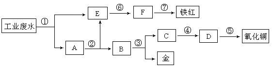 3、填空题 某工厂的酸性工业废水中含有一定量的Fe3+、Cu2+、Au3+等离子。有人设计了图中的工艺流程,利用常用的酸、碱和工业生产中的废铁屑,从废水中回收金,并生产一定量的铁红(Fe2O3)和氧化铜。(已知铜能溶解在稀硝酸中生成硝酸铜溶液)