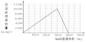。(2)在酸性溶液中通SO2将Cr2O72-还原为Cr3+,根据电子守恒及电荷守恒、原子守恒可得反应的离子方程式为3SO2 + Cr2O72- + 2H+ = 2Cr3+ + 3SO42- + H2O;常温下Ksp[Cr(OH)3] =10-32, c(Cr3+)=10-5mol/L,c3(OH-)=10-32÷10-5=10-27.所以c(OH-)=10-9mol/L.则c(H+)=Kw÷c(OH-)=10-5mol/L,因此pH=5。(3)电解还原法是利用电解产生的Fe2+将Cr2O72-还原为Cr3+.电解装置所用的电极材料是碳棒和铁片,其中铁片若要失去电子变为Fe2+,则铁片要与电源的正极连接。Cr(OH)3与稀硫酸反应化学方程式为2Cr(OH)3 + 3H2SO4 = 2Cr2(SO4)3 + 3H2O。n(Cr3+)=0.1L×0.100mol/L=0.01mol.向该溶液中加入NaOH首先发生反应:Cr3++3OH-=Cr(OH)3↓当n(NaOH)= 0.03mol,即NaOH的体积为30ml时沉淀达到最大值,再加入NaOH溶液,发生反应:Cr(OH)3+ OH-= CrO2-+ 2H2O,此时又消耗NaOH的物质的量为0.01mol,即再消耗10ml.,达到40ml时,沉淀完全溶解。之后再滴加NaOH溶液,也不会发生反应。生成沉淀的物质的量与加入NaOH溶液体积的关系图为
