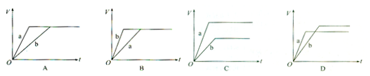 2、选择题 等质量的两份锌粉a、b,分别加入过量的稀H2SO4中,同时向a中加入少量的CuSO4溶液,下图表示产生H2的体积(V)与时间(t)的关系,其中正确的是(?)