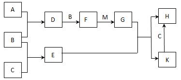 5、填空题 (12分)已知:A、B、C为中学常见的单质,A为淡黄色固体;D、E、F为中学常见的氧化物,E是具有磁性的黑色晶体;H、K为中学常见的盐;M为一种常见的无色液体。各物质间的转化关系如下图所示(某些条件已略去)。