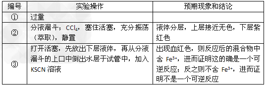 2Fe2++I2,有资料认为这可能是一个可逆反应。Fe3+与I-反应后的溶液显深红色,它是I2溶于KI溶液的颜色。为探究该深红色溶液中是否含Fe3+,进而证明这是否是一个可逆反应,试利用实验室常用仪器、用品及以下试剂设计方案并填写位于答题卷的下表。0.1?mol/L的FeCl3、KI、KSCN、NaOH、H2SO4、KMnO4溶液,CCl4,蒸馏水。
