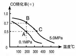 CH3CH2OH(g)+H2O(g);若密闭容器中充有10 mol CO与20mol H2,在催化剂作用下反应生成乙醇:CO的转化率(α)与温度、压强的关系如下图所示。