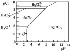 (3)Hg是水体污染的重金属元素之一。水溶液中二价汞的主要存在形态与Clˉ、OHˉ的浓度关系如右图所示[图中的物质或粒子只有Hg(OH)2为难溶物;pCl=-1gc(Clˉ)]